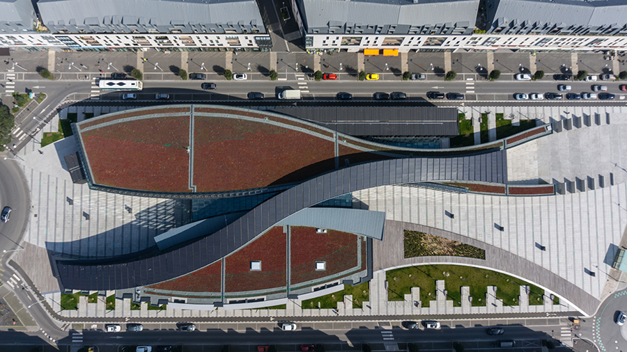 Haute Qualité Environnementale (HQE), la Grande Passerelle est recouverte de toitures végétales reliées par un long ruban aérien recouvert de panneaux photovoltaïques.